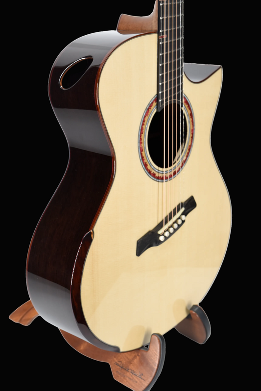 Deep OM with Back Bevel, Florentine Cutaway, Soundport, and Beveled Armrest, solid Torrefied Adirondack Spruce top with solid Madagascar Rosewood back & sides, Carbon Fiber Reinforced Mahogany neck, Ebony bridge & fingerboard, Solid Lining with Double Sides, Hozen Falcate Bracing.
