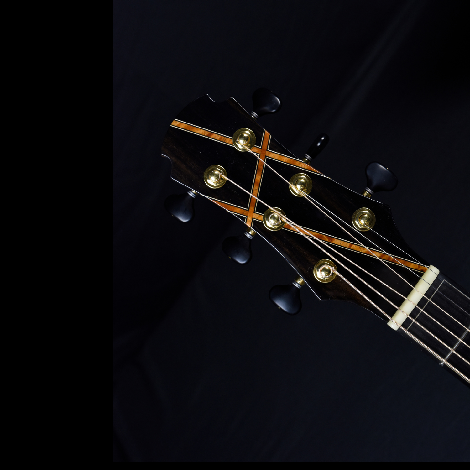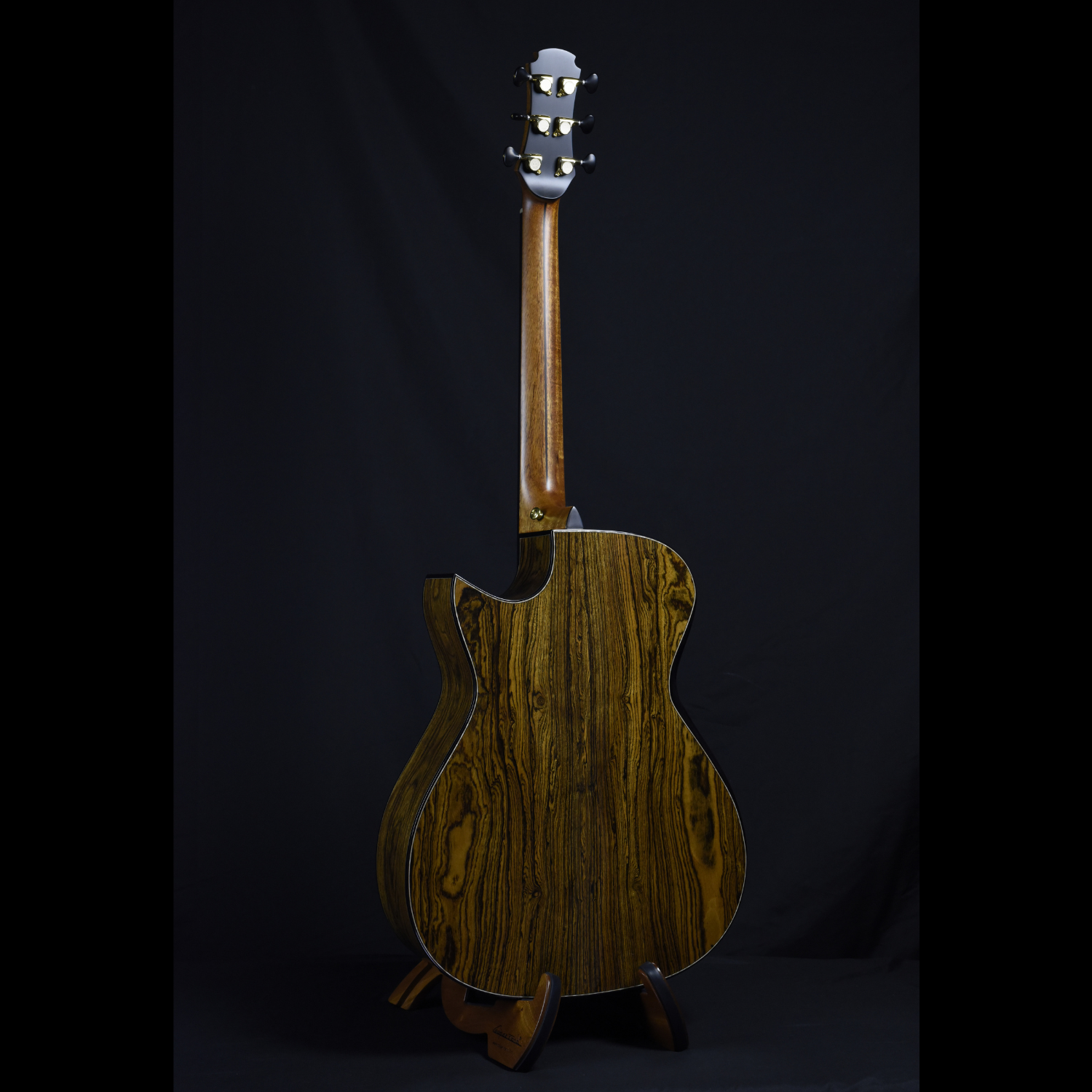 Deep OM with Florentine Cutaway, Soundport, Beveled Armrest and Back Beveled Body. Solid Adirondack Spruce top with Solid Mexican Bocote back & sides, Solid Rim Double Sides assembly with solid Lining, Carbon Fiber Reinforced Mahogany neck, Ebony bridge & fingerboard, Adirondack Hozen Lattice Bracing, "Manzer" Tapered Body Wedge.