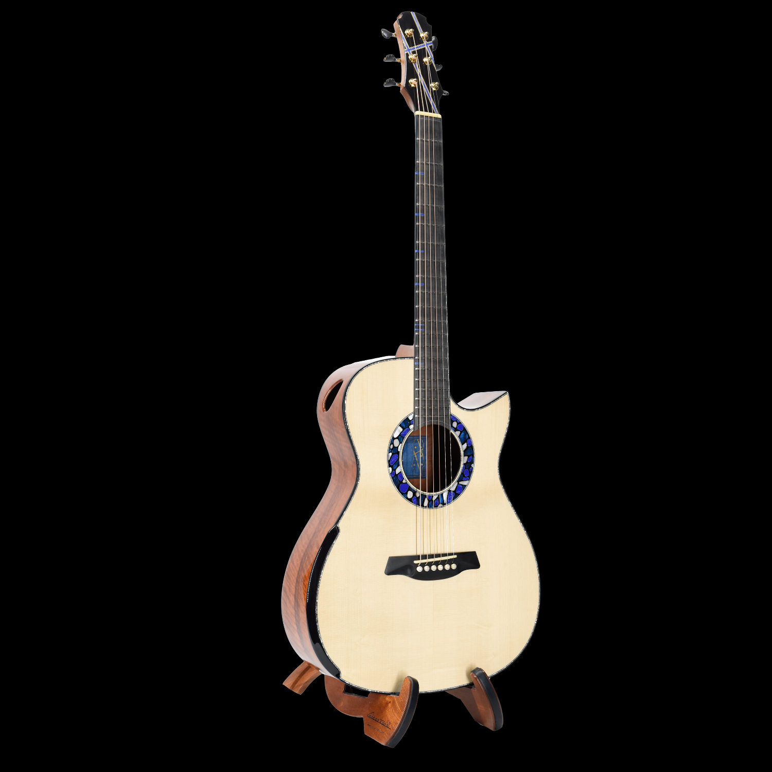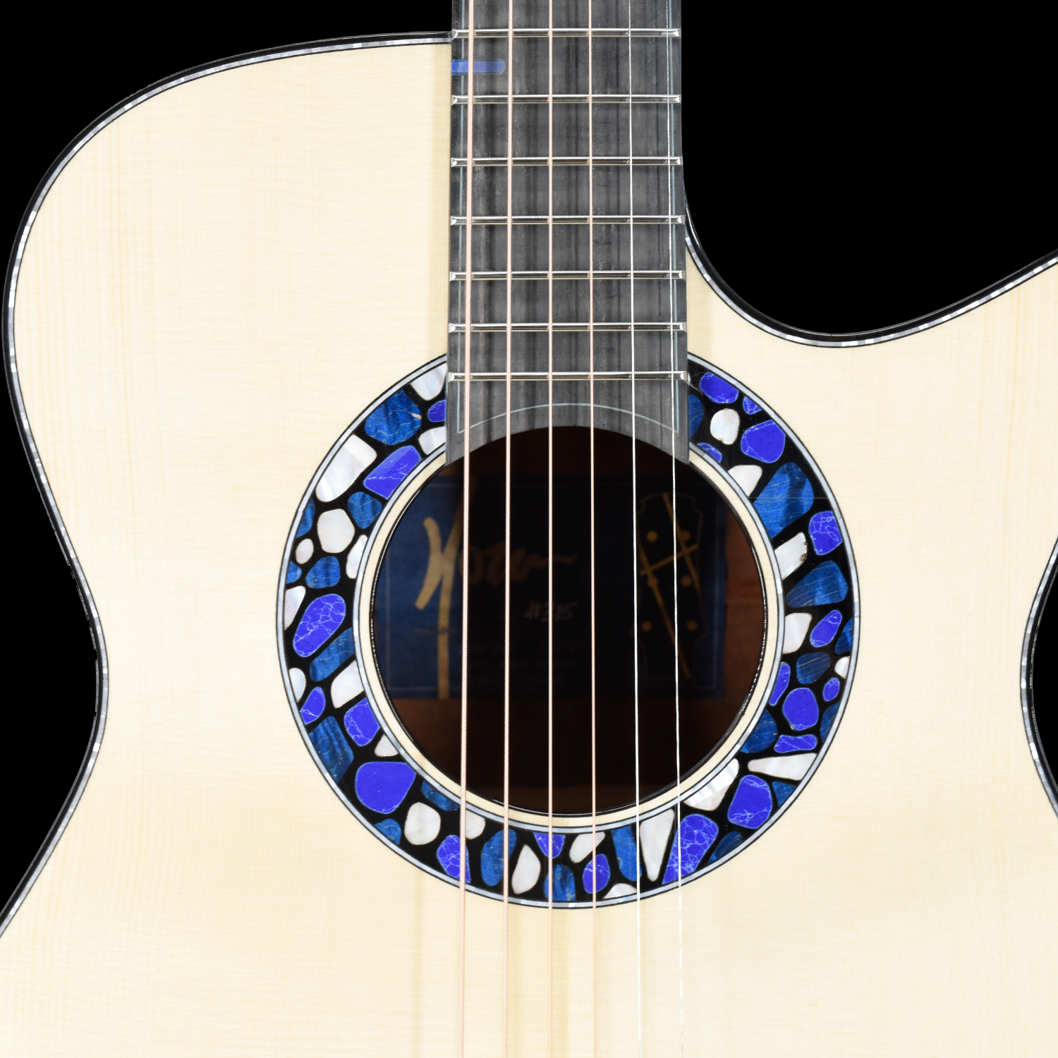 Deep OM with Florentine Cutaway, Soundport, Beveled Armrest and Back Beveled Body. Solid Swiss Moon Spruce top with Solid Guangzhou Lychee back & sides, Solid Rim Double Sides assembly with solid Lining, Carbon Fiber Reinforced Mahogany neck, Ebony bridge & fingerboard, Adirondack Hozen Lattice Bracing, "Manzer" Tapered Body Wedge. Hozen's Signature "Circle of Stone" Rosette.