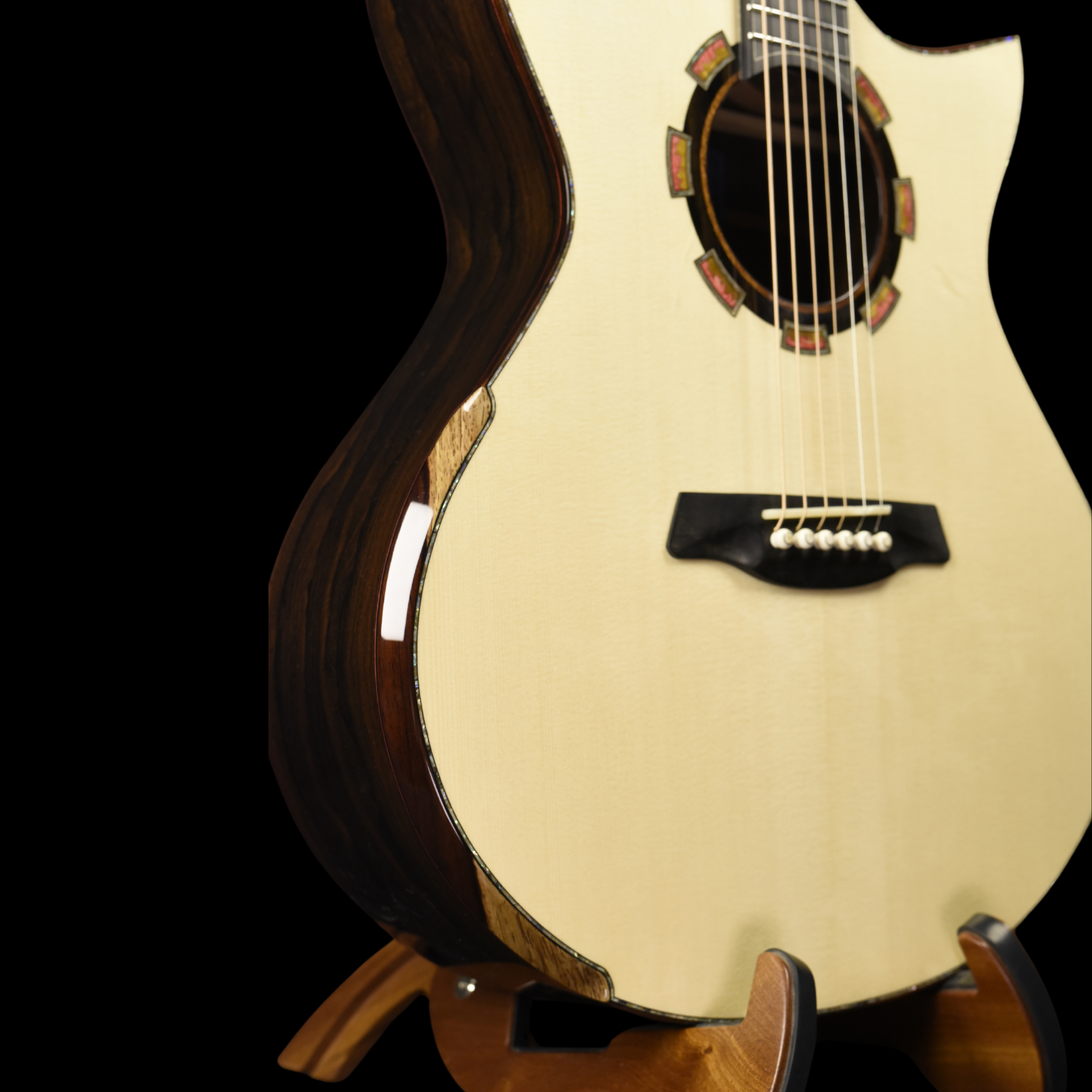 Medium Jumbo with Florentine Cutaway, Soundport, Beveled Armrest and Back Beveled Body. Solid Swiss Spruce top with solid Mexican Ziricote back & sides, Carbon Fiber Reinforced Mahogany neck, Ebony bridge & fingerboard, Solid Lining, Adirondack Brace with Double Sides and Hozen Lattice Bracing.