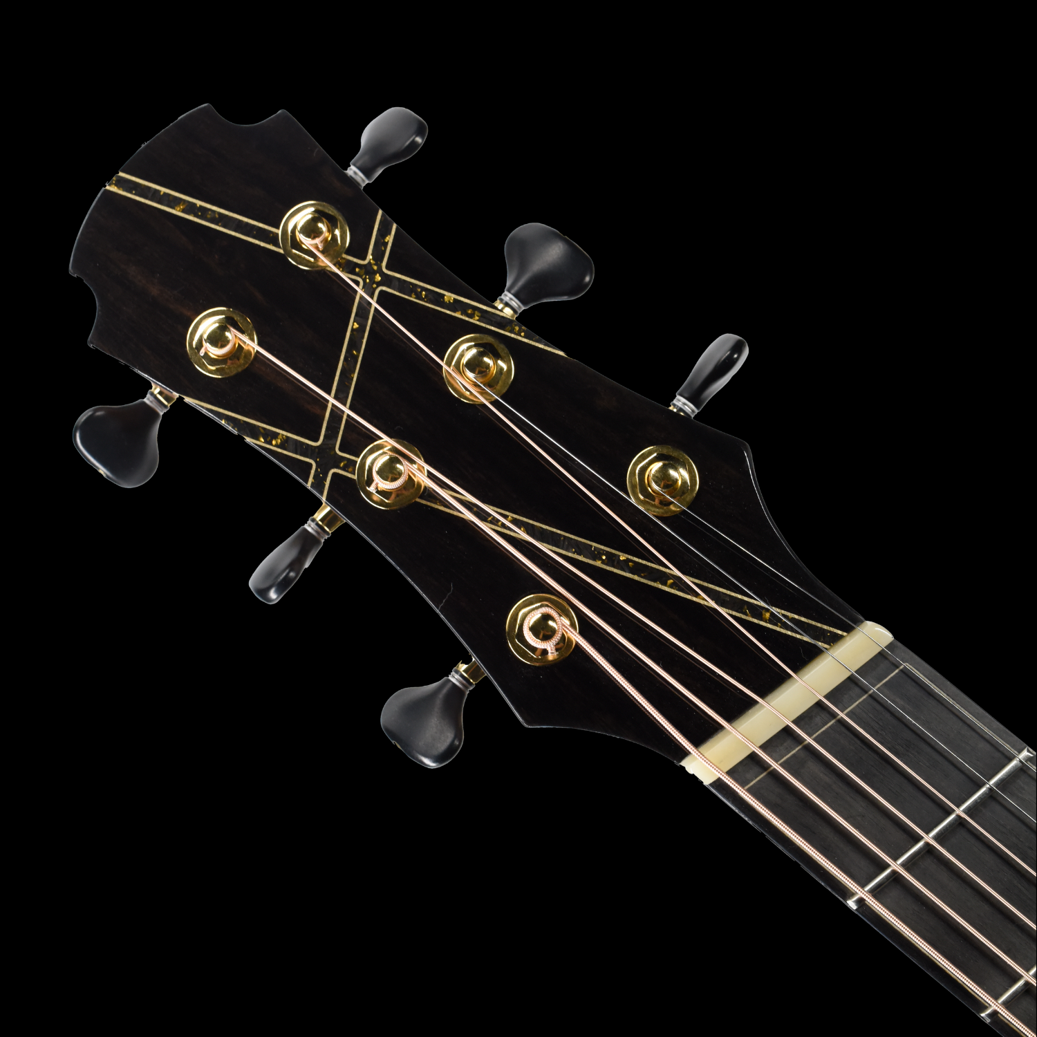 Modified Dreadnought Fanned Fret with Florentine Cutaway, Soundport, Back Bevel and Beveled Armrest, solid Torrefied Adirondack Spruce top with solid Mahogany back & sides, Carbon Fiber Reinforced Mahogany neck, Ebony bridge & fingerboard, Solid Lining with Double Sides, Hozen Lattice Bracing.